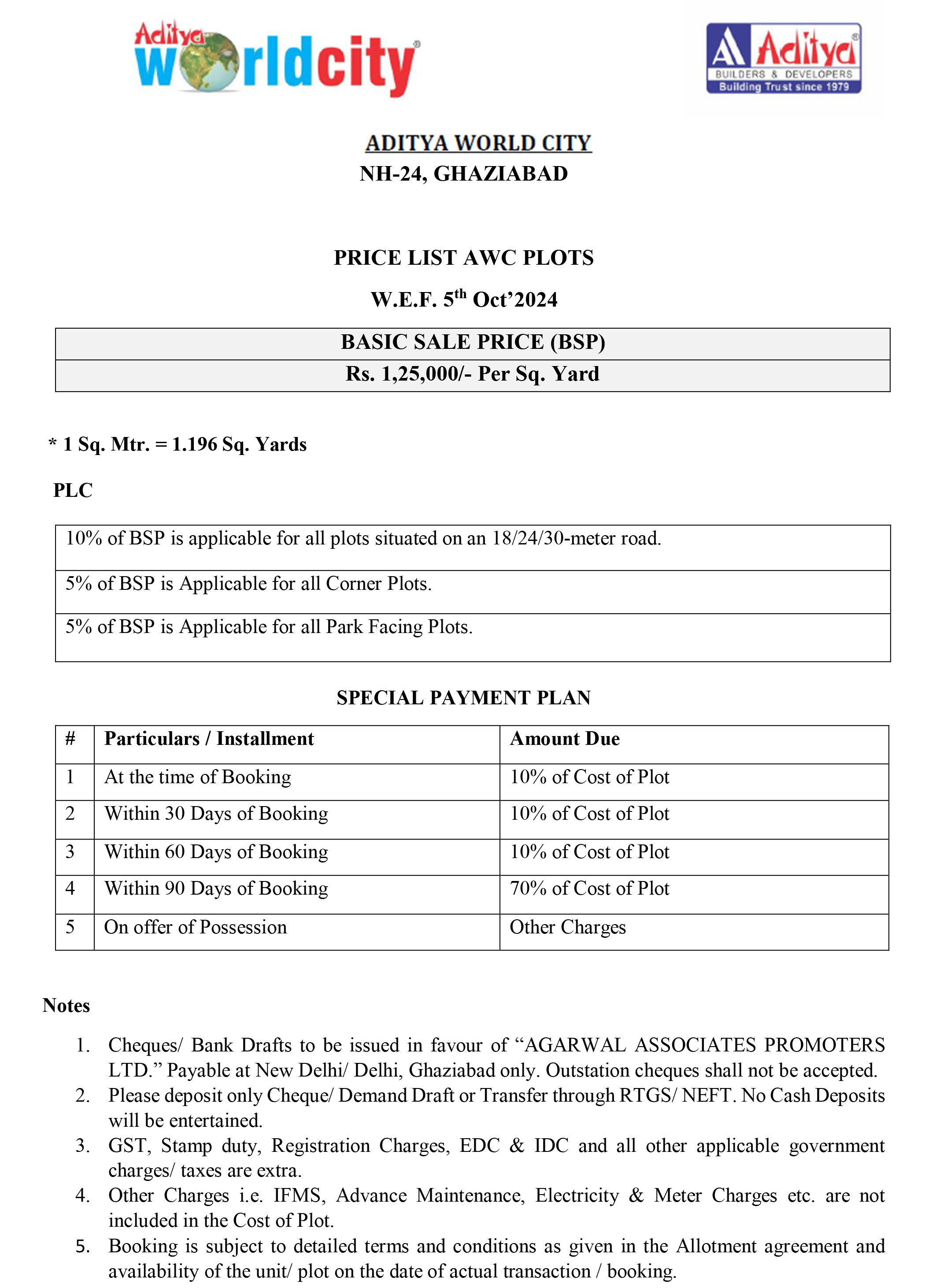 Aditya World City at NH-24 Ghaziabad is an 185 acres gda approved Integrated Township, approved by Ghaziabad Development Authority, Ghaziabad(GDA). The township sprawling in the area of 185 acres with abundance of lifestyle so that one can have their own world and space at aditya world city .Due to the location, amenities, and potential sources of income in aditya world city plots investors and purchasers of these places would receive the highest return on their investments. Urban planning experts think that NH 24 is unquestionably a better destination than the other NCR areas, given that it is equally distant from east, north, south and west so it easily covers all area of Delhi NCR moreover connectivity from 14 Lane Nh-24 ghaziabad. Moreover, 30 meter wide green belt from two sides thereof. Registered on uttar pradesh rera www.up-rera.in by UPRERAAGT10997 at ADITYA WORLD CITY nh-24 ghaziabad.Talking about the project, it covers 185 acres of land area, with sizes of 100, 135, 150, 200 gaj and many more sizes as per availablity, this new scheme land have stress- free payment plan with immediate registry.It is surrounded by lush 70% greenery and have wide belt roads, land price starts from 1,25,000/ SQFT. Over 4000+ families have already chosen ADITYA WORLD CITY as their preferred home, a township with around 15% of Green belt areas . It is already having operational school named as St. Xaviers High School. The community is guarded with 24 x 7 security ensuring absolute safety for you and your loved ones. These free hold plots NH-24 are providing gda approved residential plots in ghaziabad that is designed to unite your dreams with reality. Located in ghaziabad nh 24 , the project is a classic living destination for a peaceful, Luxurious and Ingenious lifestyle. Aditya world city plot rate Starting Price ₹ 1.25 Cr*.Our brochure included speculative descriptions of each project component, including the floor layout, payment schedule, site plan, pricing list, specifications, and amenities.Therefore, purchase a new residential home in the centre of Ghaziabad and live happily with your family.