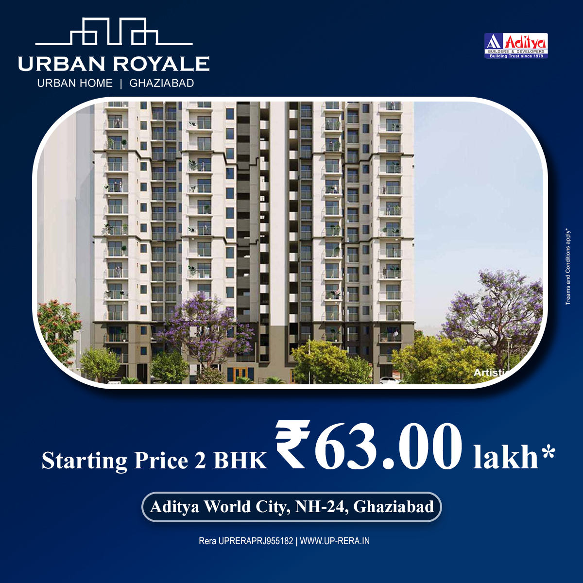 Aditya Urban Royale, the new affordable residential project designed and developed by Aditya Group. Located in the prime location of NH 24, Ghaziabad, this residential complex is the perfect embodiment of the locality's rising status along with the expansion of the National Capital Region's renowned cities. The development and design of Aditya Urban Royale have been customized to provide the ultimate living experience for homeowners, making it the most preferred destination for those seeking their dream home. With wonderful 2 BHK flats equipped with additional modular kitchens, servant rooms, and other amenities, Aditya Urban Royale Ghaziabad is a royal opportunity for buyers. If you're looking for a next-generation lifestyle, Aditya Urban Royale 1/2BHK Apartments NH 24 Ghaziabad are the perfect destination for you. These apartments are available in various sizes ranging from 600 sq.ft. to 900 sq. ft. The well-thought-out payment plan offers luxurious residences within an affordable range Price for 2BHK @63 of Size-900SQFT. Complemented by modern outdoor amenities such as a jogging track, swimming pool, sports grounds, community club, fitness zone, and more. Registered on www.up-rera.in Rera UPRERAPRJ955182.